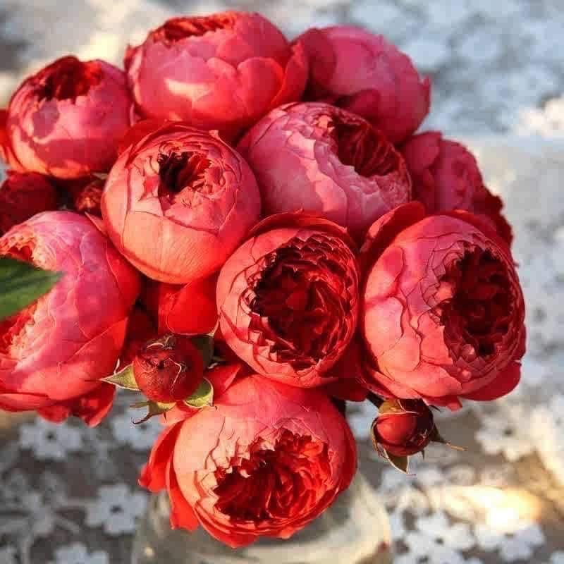 Cinnabar Bowl bred by Jiang Zhengzhi (Tianlang Roses) in 2022, is a striking Chinese cut rose with 6-8cm blooms that transition from a tightly layered, bowl-shaped bud (red with orange hints) to a dramatic flat, "exploded" form when fully open. Though nearly fragrance-free, its vibrant color and unique form compensate. With soft stems, dense thorns, and unknown disease resistance (as a new variety), it requires careful cultivation.