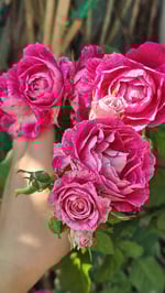 The Lady Candle rose is a Japanese import from 2015 known for its unique off-white petals with pink streaks or spots. It is a shrub rose with medium-sized, continuously blooming flowers and has a mild or nonexistent fragrance. This rose is primarily cultivated as a cut flower due to its striking coloring and strong stems.