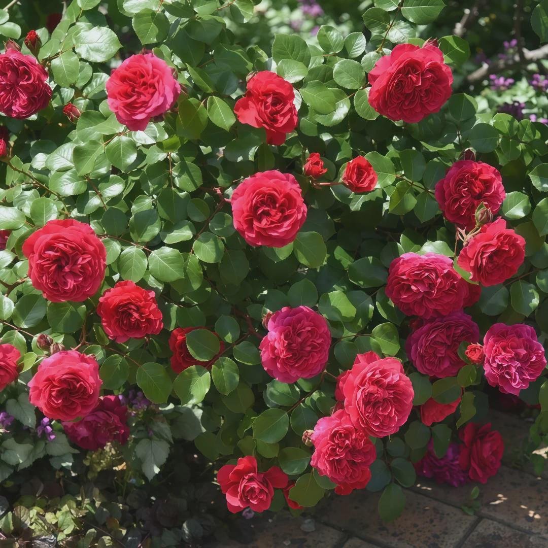 The 'Red Leonardo da Vinci' (Meilland, 2003), also called 'Hilde Umtasch' or 'Red Davinci', is a romantic French shrub rose with pure red-purple blooms (7-9cm). Notable for its rain resistance, healthy foliage, and mild fragrance, it thrives in heat/cold (USDA Zone 5+) and flowers prolifically. Its enduring beauty at all bloom stages makes it a standout landscape choice.
